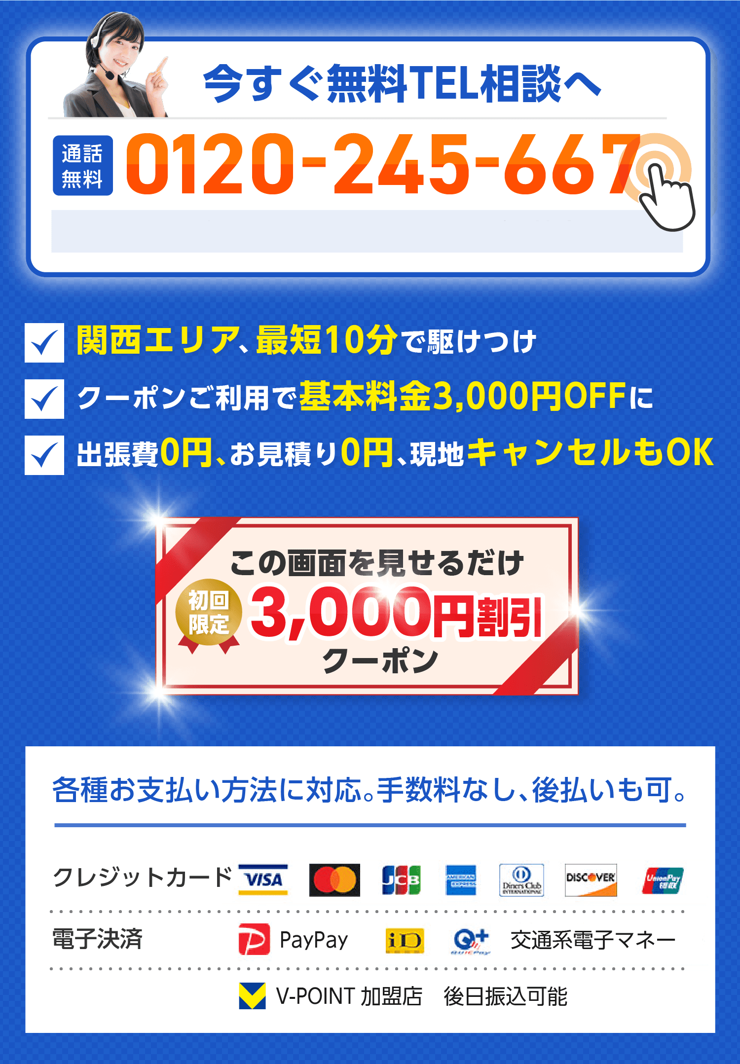 関西エリアは、お電話から最短10分、メールフォーム送信から最短30分でお伺いします。